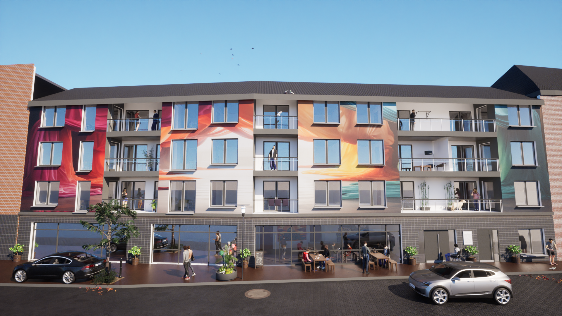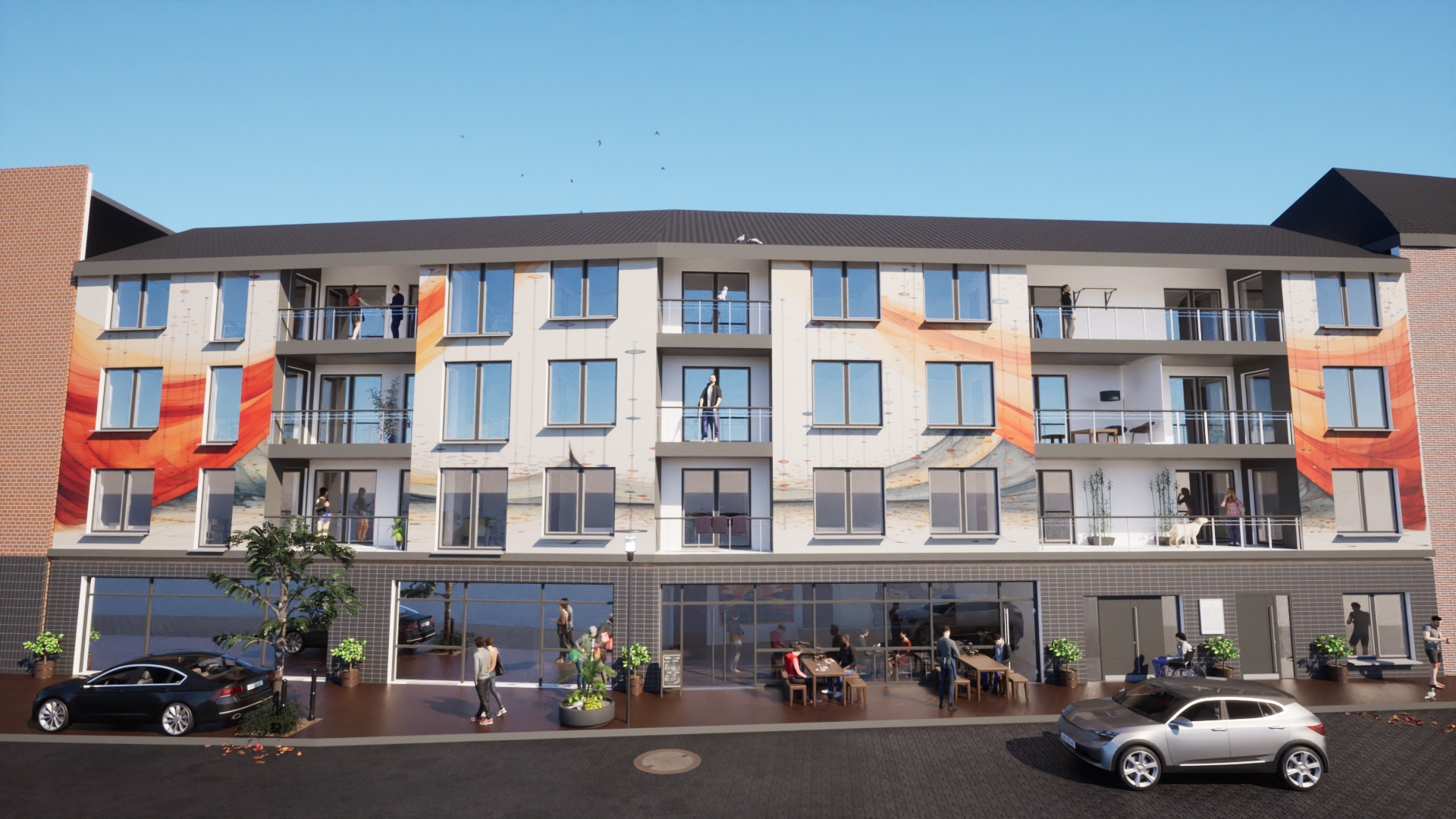 Insgesamt soll ein Mehrfamilienhaus mit 44 Wohneinheiten und 3 Gewerbeeinheiten im Erdgeschoss entstehen.